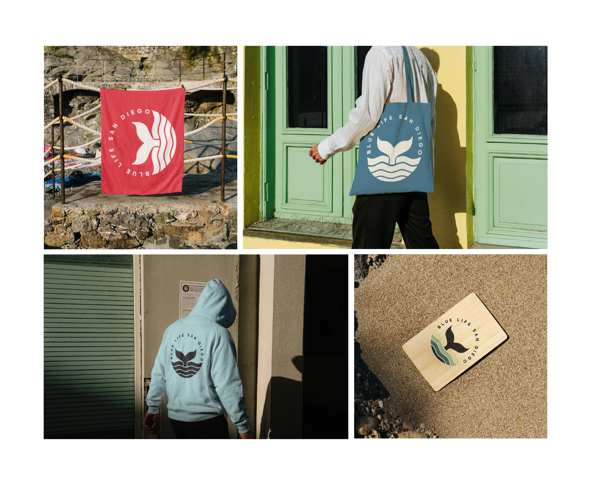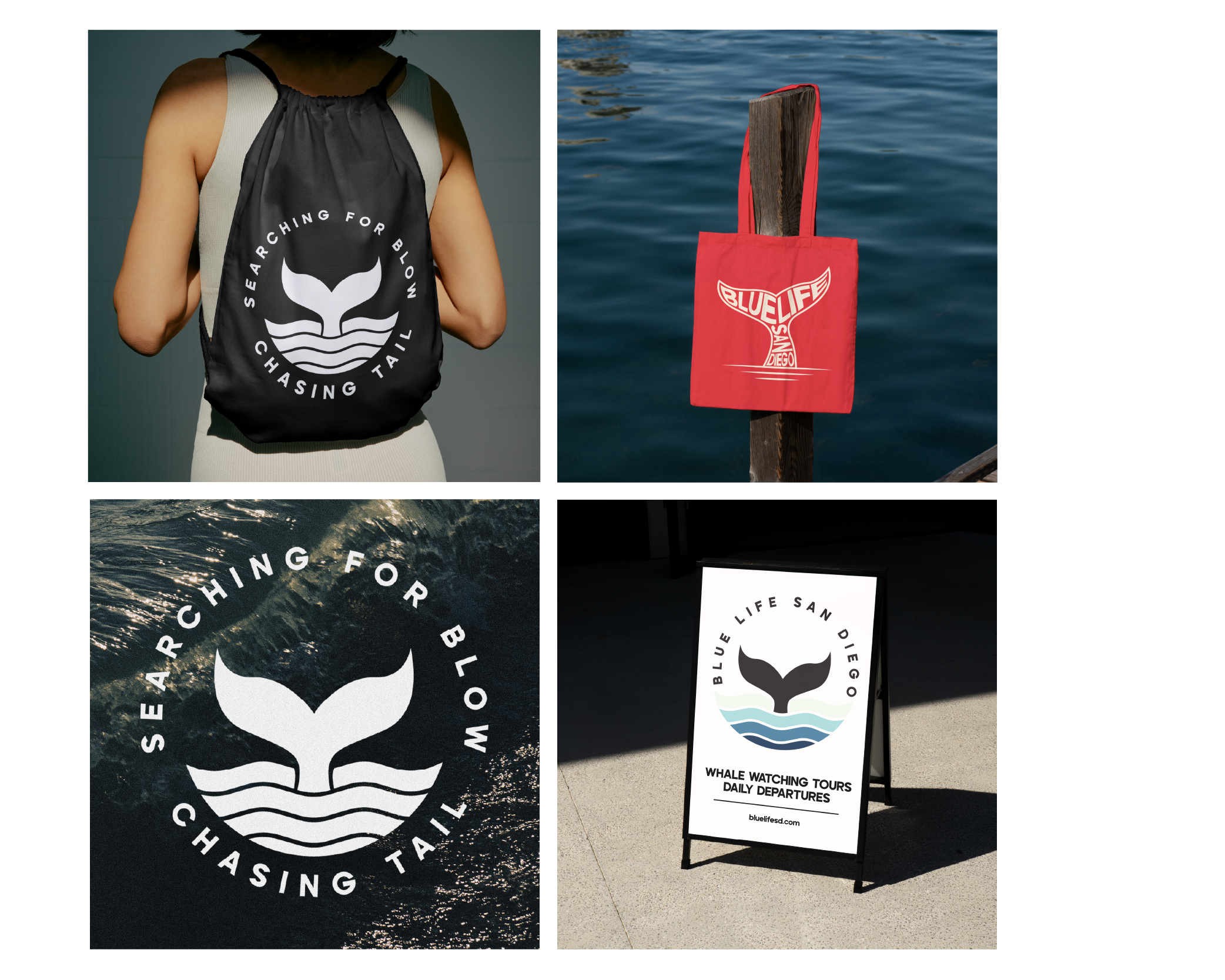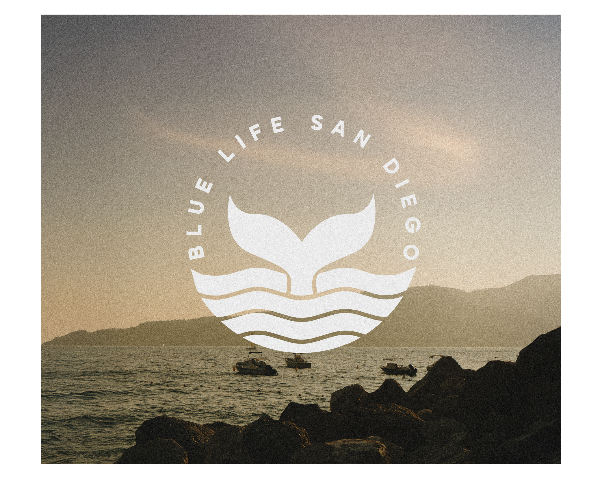 Blue Life San Diego is a whale watching tour company based along the Southern California coast. The goal of this project was to create a brand identity that reflects the experience of being out on the water while remaining simple and recognizable for visitors exploring the San Diego harbor. The logo centers around a whale tail rising from the ocean, a familiar moment many people hope to see when they go whale watching. The surrounding circular form references the horizon line and creates a contained mark that works well across signage, merchandise, apparel, and digital platforms. The identity system uses a coastal color palette and clean geometric typography to keep the brand feeling modern and approachable. Together, these elements create a flexible visual system that can live comfortably across tour materials, clothing, signage, and promotional graphics.