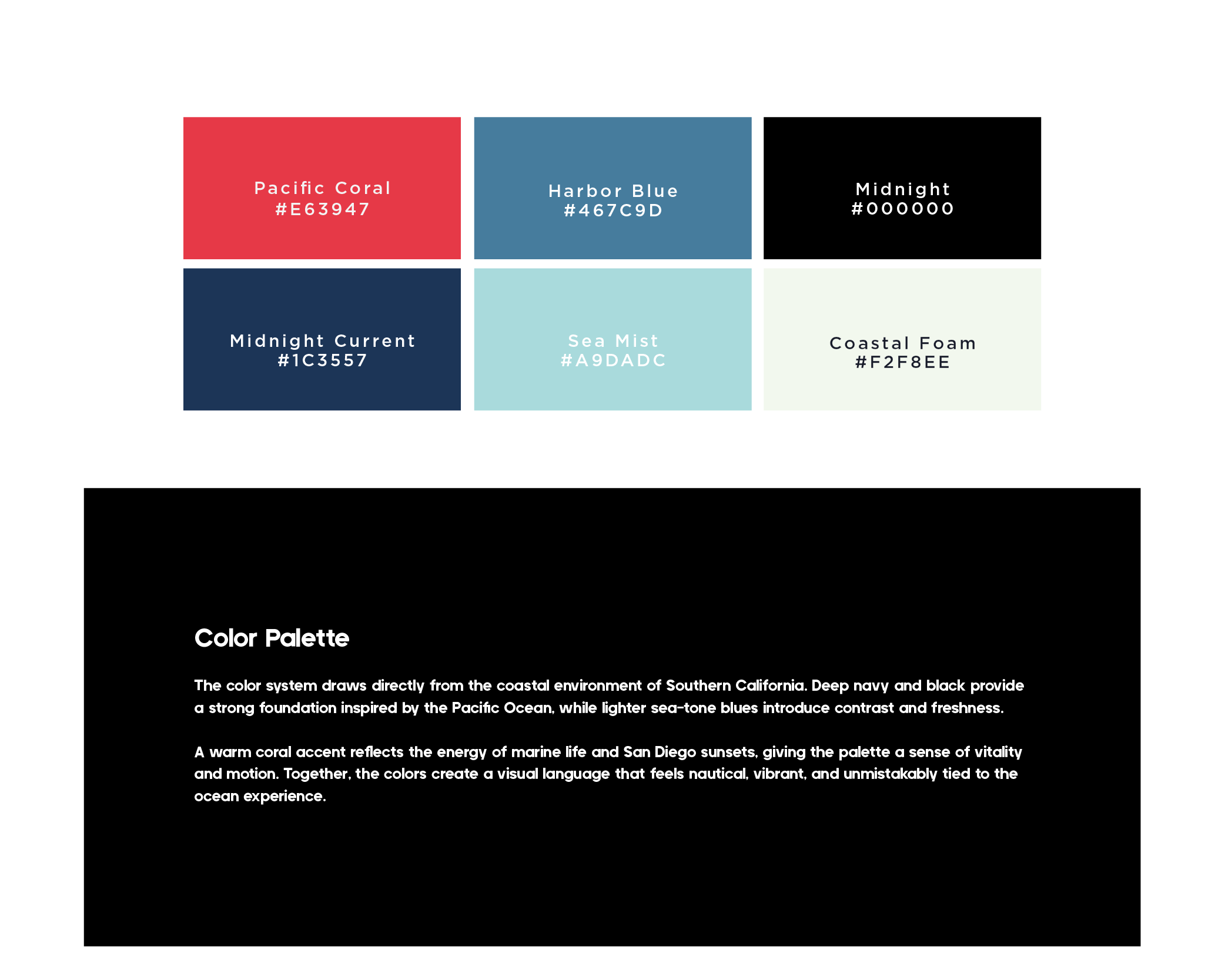 Brand identity for a San Diego whale watching company. The project focused on creating a modern coastal identity that reflects the movement of the ocean and the experience of encountering marine life.